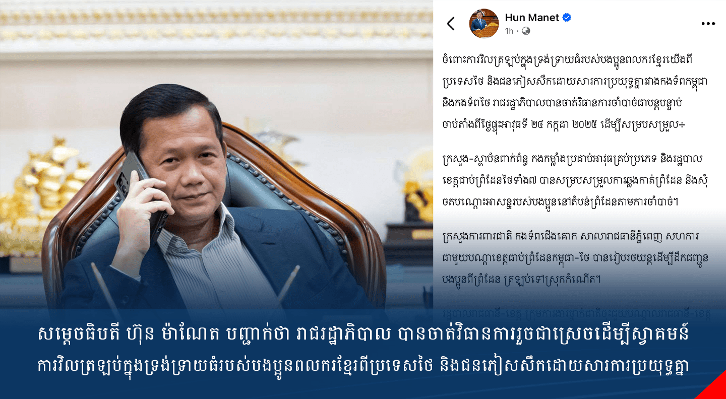 ព្រឹទ្ធសភា សូមវាយតម្លៃខ្ពស់ចំពោះការបញ្ចេញមតិកាលពីថ្ងៃទី៦ ខែតុលា ឆ្នាំ២០២៥ របស់ សម្តេចតេជោ ហ៊ុន សែន ប្រកបដោយភាពឈ្លាសវៃ អត់ធ្មត់ និងក្នុងស្មារតីជារដ្ឋបុរស ដោយបានឆ្លុះបញ្ចាំងពីភាពជាអ្នកដឹកនាំប្រកបដោយសីលធម៌ និងស្មារតីទទួលខុសត្រូវខ្ពស់។