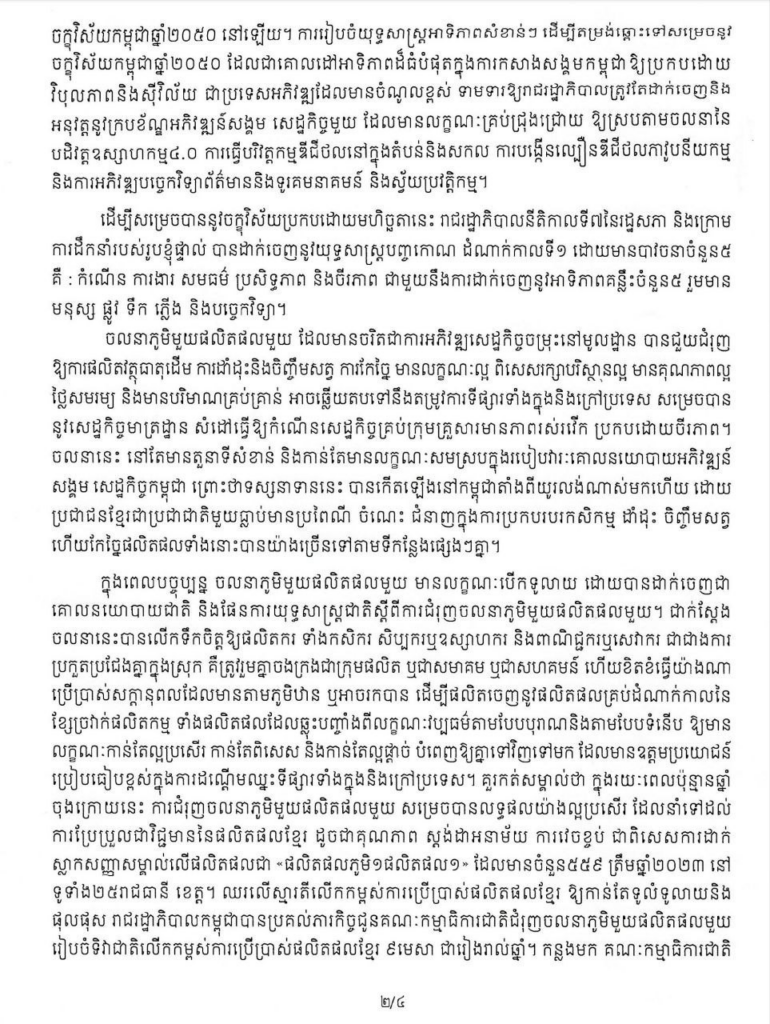 ទី១- គ្រប់ក្រសួង ស្ថាប័នពាក់ព័ន្ធទាំងអស់ ត្រូវយកចិត្តទុកដាក់ចូលរួមចំណែកលើកកម្ពស់ ជំរុញ និងបំផុសចលនាដាំដុះ ចិញ្ចឹមសត្វ ផលិត កែច្នៃ និងអភិវឌ្ឍនូវផលិតផលគ្រប់ប្រភេទតាមគ្រួសារ សហគមន៍ បណ្តុំអ្នកផលិត ប្រកបដោយគំនិតច្នៃប្រឌិតនិងរស់រវើក ជាពិសេសការកែច្នៃផលិតផលកសិកម្មជាមូលដ្ឋាន ទៅជាម្ហូបអាហារ វត្ថុសិល្បៈ ឬរបស់ប្រើប្រាស់ផ្សេងៗ សម្រាប់ផ្គត់ផ្គង់ទីផ្សារទាំងក្នុងនិងក្រៅប្រទេស ដើម្បីជាការរួមចំណែកលើកកម្ពស់កម្រិតជីវភាពពលរដ្ឋខ្មែរគ្រប់រូបឱ្យកាន់តែល្អប្រសើរឡើង។
