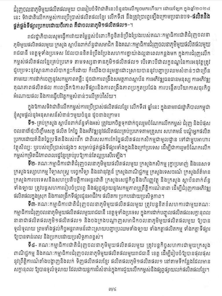 ទី៤- គណៈកម្មាធិការជាតិជំរុញចលនាភូមិមួយផលិតផលមួយ ត្រូវបន្តកិច្ចសហការជាមួយក្រសួងពាណិជ្ជកម្ម និងគណៈកម្មាធិការជំរុញចលនាភូមិមួយផលិតផលមួយរាជធានី ខេត្ត ដើម្បីរៀបចំឱ្យបានផុលផុស នូវព្រឹត្តិការណ៍តាំងបង្ហាញនិងលក់ ទិញផលិតផលខ្មែរ ផលិតផលភូមិ១ផលិតផល១ នៅតាមទីកន្លែងដែលមានសក្តានុពលឱ្យបានទូលំទូលាយ ដែលជាយន្តការដ៏សំខាន់ក្នុងការជួយលើកកម្ពស់និងផ្សព្វផ្សាយលក់ផលិតផលខ្មែរ៕