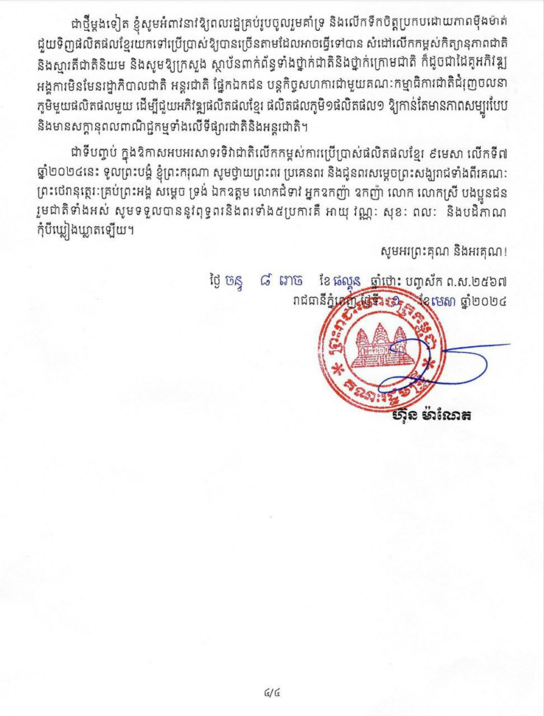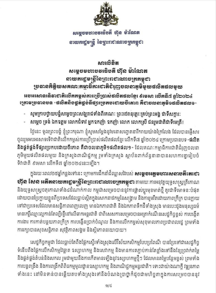 សម្ដេចធិបតី ហ៊ុន ម៉ាណែត នាយករដ្ឋមន្រ្ដីនៃព្រះរាជាណាចក្រកម្ពុជា នៅក្នុងឱកាសអបអរសាទរទិវាជាតិលើកកម្ពស់ការប្រើប្រាស់ផលិតផលខ្មែរ ៩ មេសា លើកទី៧ ឆ្នាំ២០២៤ ក្រោមប្រធានបទ «ផលិត និងផ្គត់ផ្គង់ទីផ្សារប្រកបដោយចីរភាព គឺជាចលនាភូមិ១ផលិតផល១» បានផ្ដល់អនុសាសន៍ចំនួន៤ចំណុច ដើម្បីពង្រឹងសមត្ថភាពស្ថាប័ន ការអភិវឌ្ឍធនធានមនុស្ស ការអភិវឌ្ឍ គុណភាពផលិតផល ការពង្រីកឱកាសទីផ្សារនិងការពង្រឹងភាពប្រកួតប្រជែង ការបង្កើតបរិយាកាសធុរកិច្ចអំណោយផល និងការធ្វើបរិវត្តកម្មសំខាន់ៗលើគ្រប់វិស័យ។
