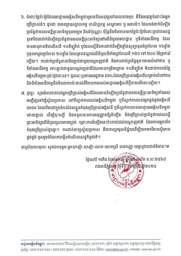 អាជ្ញាធរអគ្គិសនីកម្ពុជា ចេញសេចក្ដីបំភ្លឺព័ត៌មានបន្ថែម ពាក់ព័ន្ធនឹងការធ្វើស្វ័យប្រកាសអំពី «ការដំឡើងនិងការប្រើប្រាស់ប្រព័ន្ធពន្លឺព្រះអាទិត្យលើដំបូល»