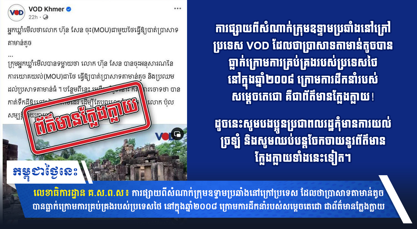 ភ្នំពេញ៖ លេខាធិការដ្ឋានគណៈកម្មាធិការជាតិសម្របសម្រួលកិច្ចការព័ត៌មាន និងសាធារណមតិ (គ.ស.ព.ស) បានលើកឡើងថា រាល់ព័ត៌មានទាំងឡាយទាក់ទងនឹងបញ្ហាព្រំដែន និងបញ្ហាផ្សេងៗទៀតដែលបុគ្គលនេះនិយាយជាការភូតកុហក បំភ្លៃ បំផ្លើស បំភ័ន្តទាំងអស់។ អតីតទណ្ឌិតរូបនេះគ្មានតម្លៃក្នុងការនិយាយពីបញ្ហាជាតិទេ។