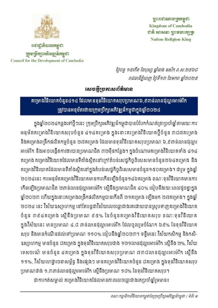 ក្រុមប្រឹក្សាអភិវឌ្ឍន៍កម្ពុជា៖ គម្រោងវិនិយោគចំនួន ៤១៤ ដែលមានទុនវិនិយោគសរុបប្រមាណ ៦,៩ពាន់លានដុល្លារអាម៉េរិកត្រូវបានអនុម័តដោយក្រុមប្រឹក្សាអភិវឌ្ឍន៍កម្ពុជា ក្នុងឆ្នាំ២០២៤