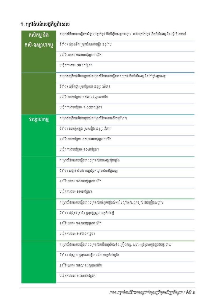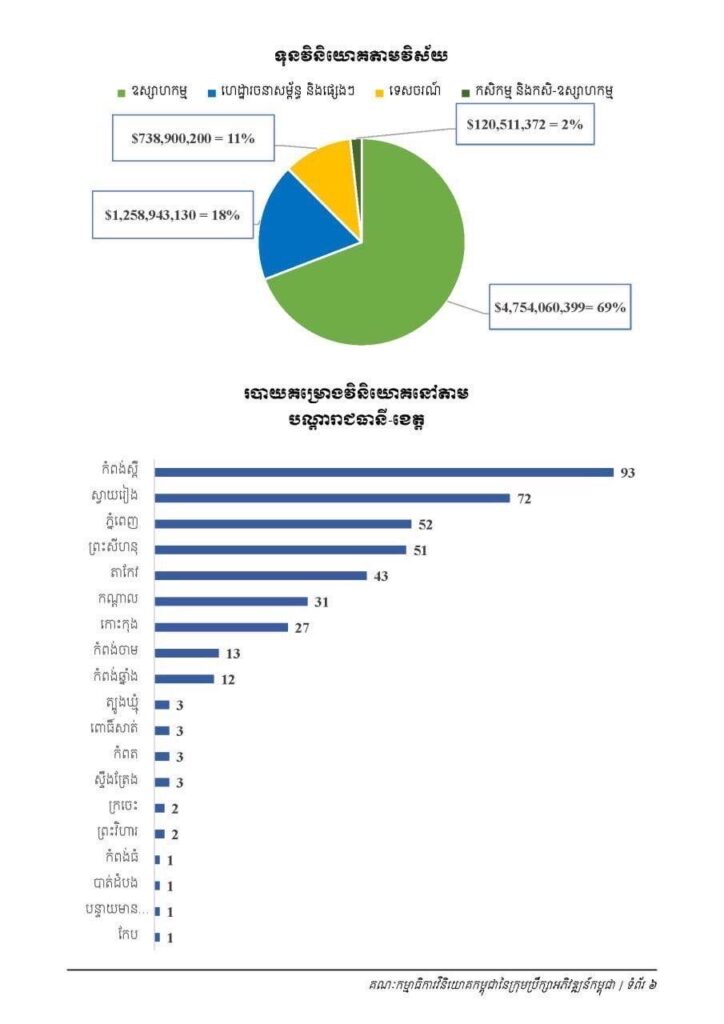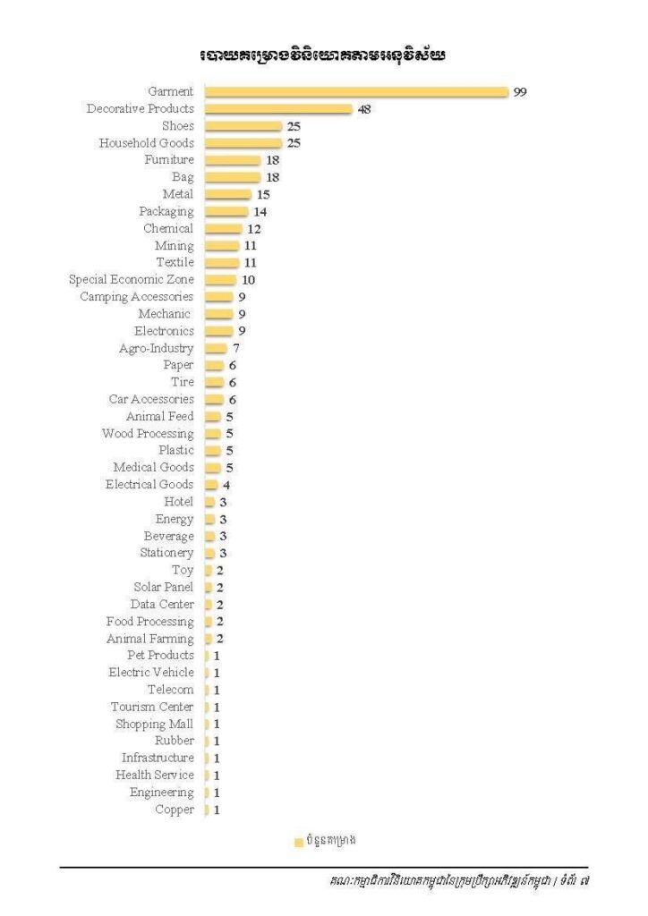 ក្នុងឆ្នាំ២០២៤កន្លងទៅថ្មីៗនេះ ក្រុមប្រឹក្សាអភិវឌ្ឍន៍កម្ពុជាបានបំបែកកំណត់ត្រាប្រចាំឆ្នាំតាមរយៈការ អនុម័តគម្រោងវិនិយោគសរុបចំនួន ៤១៤គម្រោង ក្នុងនោះគម្រោងវិនិយោគថ្មីចំនួន ៣៨៧គម្រោង និងគម្រោងពង្រីកផលិតកម្មចំនួន ២៧គម្រោង ដែលមានទុនវិនិយោគសរុបប្រមាណ ៦,៩ពាន់លានដុល្លារ អាម៉េរិក និងអាចបង្កើតការងារបានប្រមាណជិត ៣២ម៉ឺនកន្លែង។ ក្នុងចំណោមគម្រោងវិនិយោគទាំង ៤១៤ គម្រោង គម្រោងវិនិយោគដែលមានទីតាំងស្ថិតនៅក្រៅតំបន់សេដ្ឋកិច្ចពិសេសមានចំនួន២៦៤គម្រោង និង គម្រោងវិនិយោគដែលមានទីតាំងស្ថិតនៅក្នុងតំបន់សេដ្ឋកិច្ចពិសេសមានចំនួន១៥០គម្រោង។ ជារួម ក្នុងឆ្នាំ ២០២៤នេះ ការអនុម័តគម្រោងវិនិយោគមានការកើនឡើងចំនួន១៤៦គម្រោង ខណៈទុនវិនិយោគមានការ កើនឡើងប្រមាណជិត ២ពាន់លានដុល្លារអាម៉េរិក ស្មើនឹងប្រមាណជិត ៤០% ធៀបនឹងរយៈពេលដូចគ្នាក្នុង ឆ្នាំ២០២៣ ហើយក្នុងនោះគម្រោងពង្រីកផលិតកម្មបានកើនពី ២១គម្រោង ឡើងមក ២៧គម្រោង។ ក្នុងឆ្នាំ ២០២៤ នេះ វិស័យឧស្សាហកម្ម នៅតែបន្តជាវិស័យលេចធ្លោជាងគេដោយបានស្រូបទាញគម្រោងវិនិយោគ ចំនួន ៣៩៤គម្រោង ស្មើនឹងប្រមាណ ៩៥% នៃចំនួនគម្រោងវិនិយោគសរុប ខណៈទុនវិនិយោគ ក្នុងវិស័យនេះ មានប្រមាណ ៤,៨ ពាន់លានដុល្លារអាម៉េរិក ដែលចូលរួមចំណែក ៦៩% នៃទុនវិនិយោគ សរុប និងមានកំណើនដល់ទៅប្រមាណ ១១០% ធៀបនឹងឆ្នាំ២០២៣។ ទន្ទឹមនេះ វិស័យកសិកម្ម និងកសិ- ឧស្សាហកម្ម មានចំនួន ៨គម្រោង ក្នុងទុនវិនិយោគសរុបជាង ១២១លានដុល្លារអាម៉េរិក ស្មើនឹង ២%, វិស័យ ទេសចរណ៍ មានចំនួន ៤គម្រោង ក្នុងទុនវិនិយោគសរុបប្រមាណ ៧៣៨លានដុល្លារអាម៉េរិក ស្មើនឹង ១១%, វិស័យហេដ្ឋារចនាសម្ព័ន្ធ និងផ្សេងៗ មានគម្រោងវិនិយោគចំនួន ៨គម្រោង ក្នុងទុនវិនិយោគសរុប ប្រមាណជាង ១,៣ពាន់លានដុល្លារអាម៉េរិក ស្មើនឹងប្រមាណ ១៨% នៃទុនវិនិយោគសរុប៕