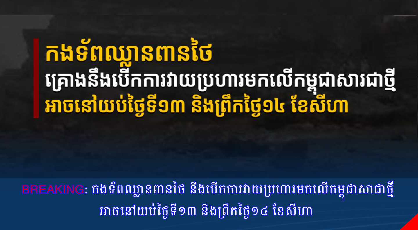 គួរបញ្ជាក់ថា បទឈប់បាញ់មួយរវាងកម្ពុជា និងថៃត្រូវបានសម្រេចឡើង ក្រោយកិច្ចប្រជុំបន្ទាន់រវាងនាយករដ្ឋមន្រ្តីកម្ពុជា សម្តេចបវរធិបតី ហ៊ុន ម៉ាណែត និងនាយករដ្ឋមន្រ្តីស្តីទីថៃ លោក Phumtham Wechayachai នៅរសៀលថ្ងៃចន្ទ ក្នុងទីក្រុងកូឡាឡាំពួ ប្រទេសម៉ាឡេស៊ី ក្រោមការសម្របសម្រួលរបស់ លោក អានវ៉ា អ៉ីប្រាហ៉ីម នាយករដ្ឋមន្រ្តីម៉ាឡេស៊ី ដោយមានការចូលរួមពីតំណាងសហរដ្ឋអាមេរិក និងចិន៕