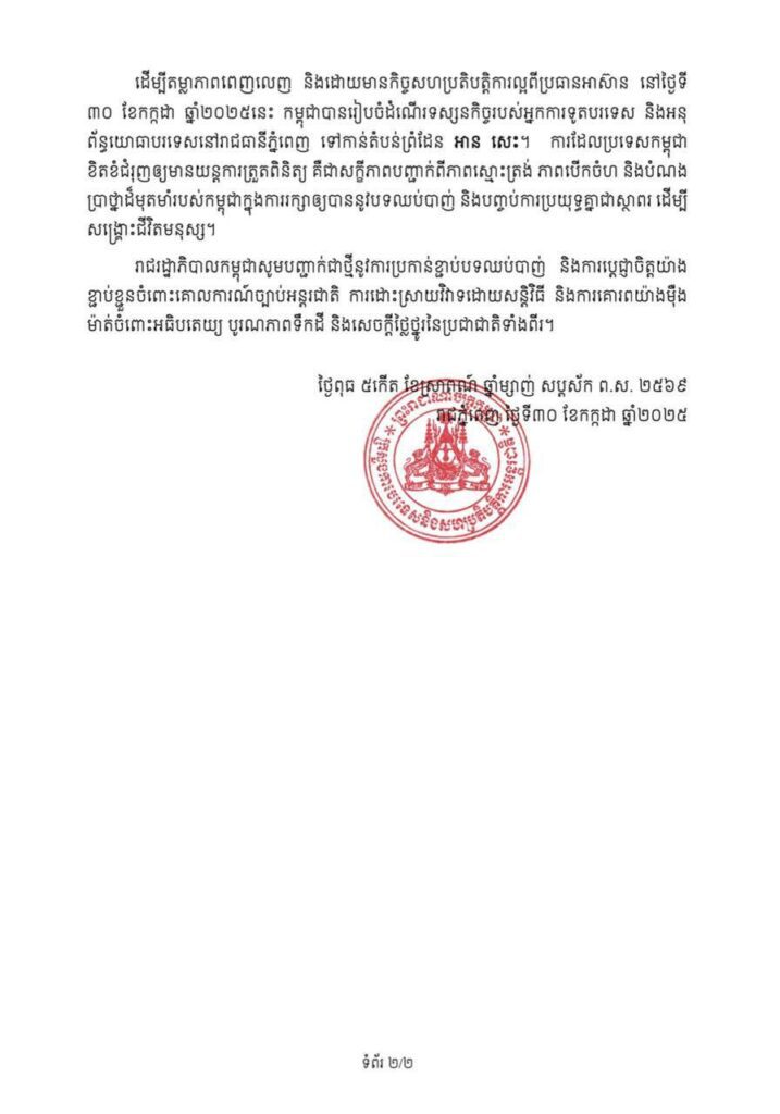 សេចក្តីថ្លែងការណ៍របស់ក្រសួងការបរទេស និងសហប្រតិបត្តិការអន្តរជាតិនៃព្រះរាជាណាចក្រកម្ពុជា បដិសេធការចោទប្រកាន់របស់ថៃអំពីការរំលោភបទឈប់បាញ់