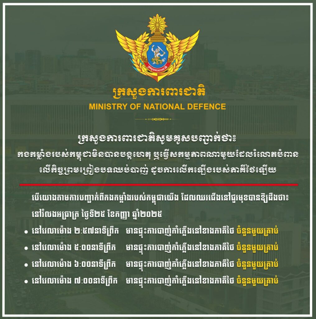 ក្រសួងការពារជាតិ នៃព្រះរាជាណាចក្រកម្ពុជា សូមជម្រាបជូនព័ត៌មានដល់សាធារណជនជាតិ និងអន្តរ ជាតិមេត្តាជ្រាបថា៖ នៅព្រឹកថ្ងៃទី២៥ ខែកញ្ញា ឆ្នាំ២០២៥ មានផេកផ្លូវការរបស់កងទ័ពជើងគោកថៃ និងសារព័ត៌មានរបស់ថៃមួយចំនួនបានចុះផ្សាយថា “កម្ពុជាបង្កហេតុពេញមួយយប់នៅតំបន់យោធភូមិ ភាគទី២” ដោយឮសម្លេងកាំភ្លើង, សម្លេងផ្ទុះគ្រាប់បែក, រកឃើញការចូលជិតលួសបន្លាហើយការបាញ់ ដើម្បីពិនិត្យមើលរយៈចម្ងាយ។