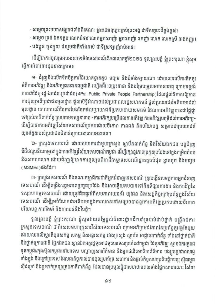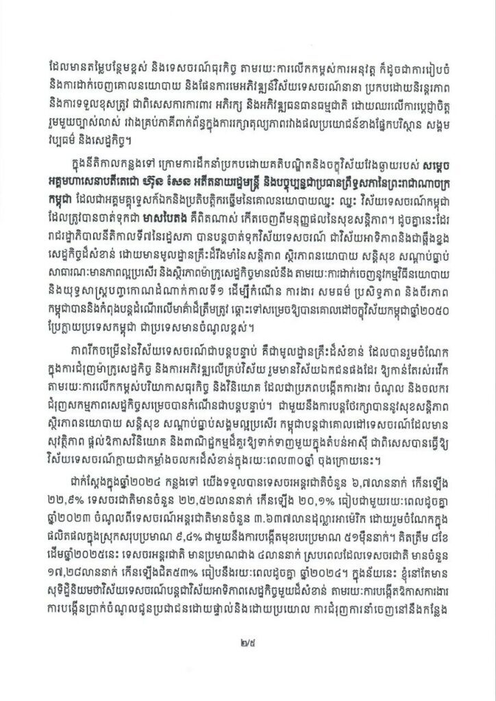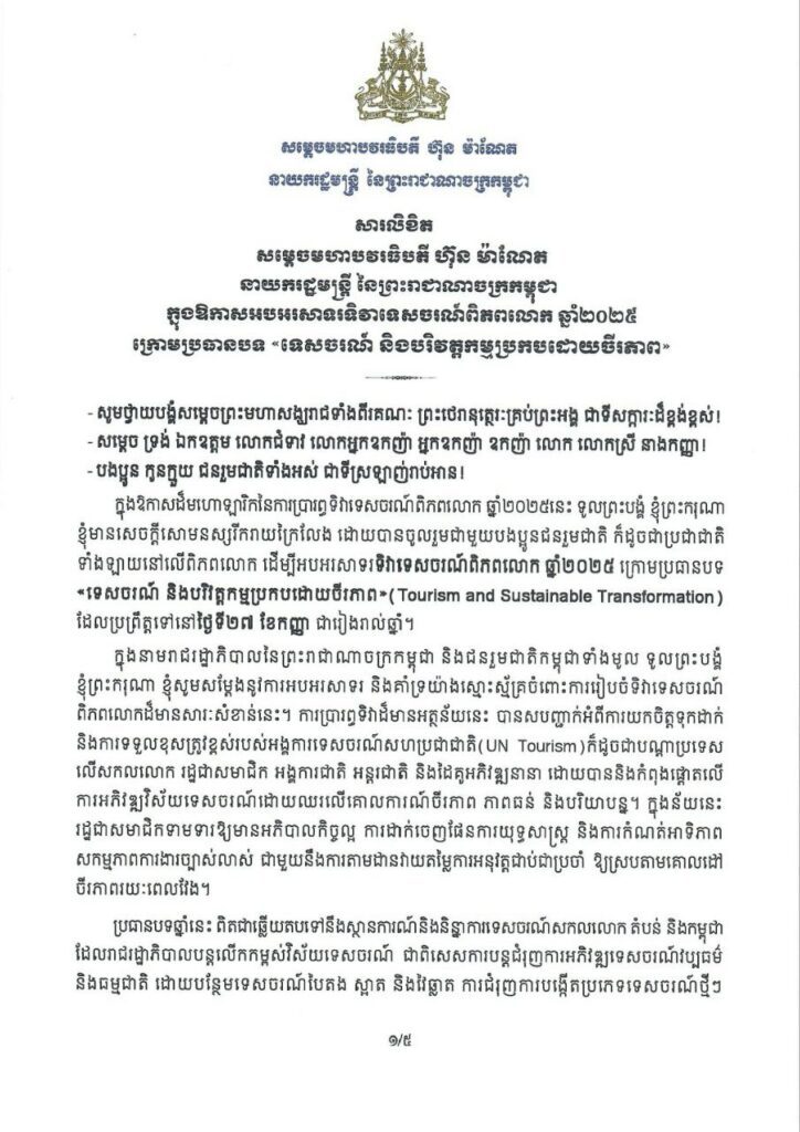 សារលិខិត សម្តេចមហាបវរធិបតី ហ៊ុន ម៉ាណែត នាយករដ្ឋមន្ត្រី នៃព្រះរាជាណាចក្រកម្ពុជា ក្នុងឱកាសអបអរសាទរទិវាទេសចរណ៍ពិភពលោក ឆ្នាំ២០២៥ ក្រោមប្រធានបទ «ទេសចរណ៍ និងបរិវត្តកម្មប្រកបដោយចីរភាព»