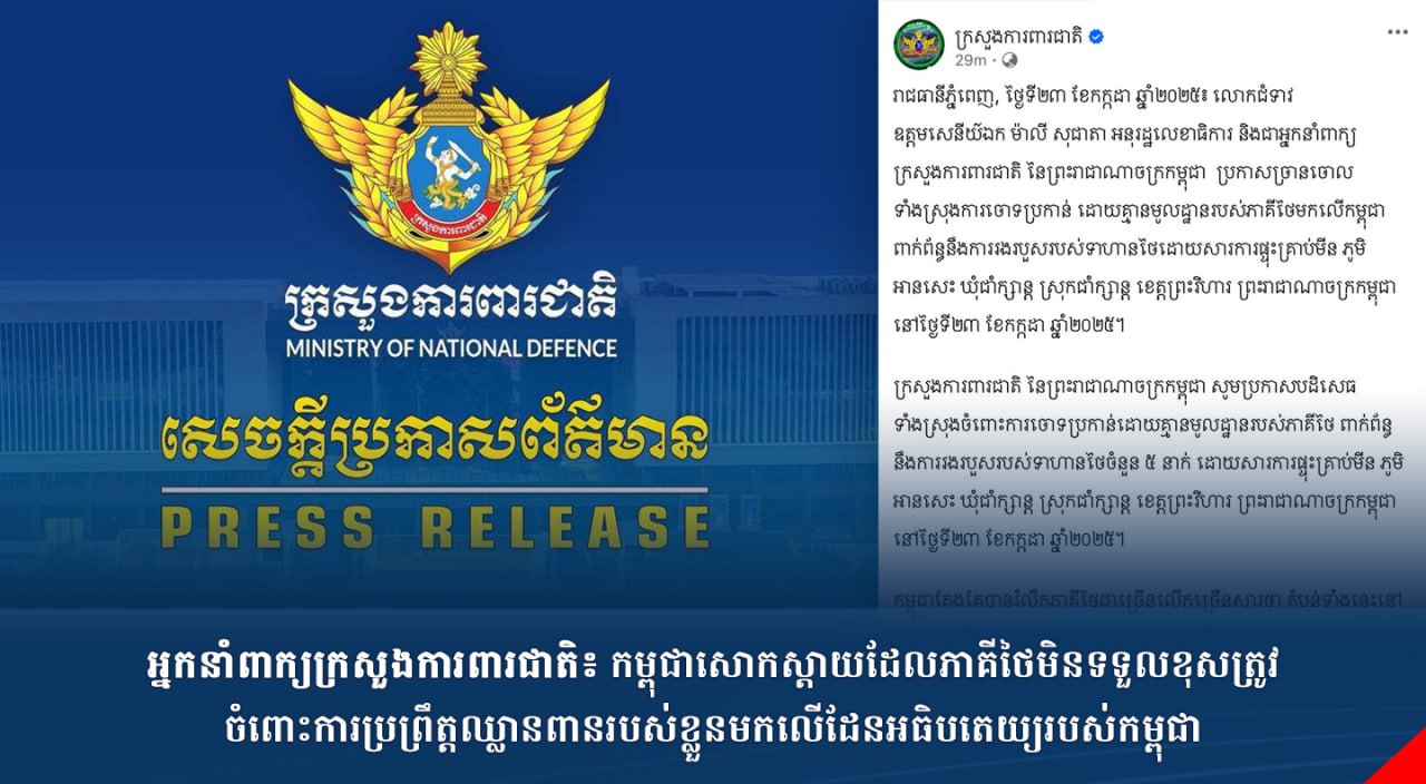 បានបញ្ជាក់ថា នៅព្រឹកថ្ងៃទី២៧ ខែកញ្ញា ឆ្នាំ២០២៥ វេលាម៉ោងប្រមាណ ១១:៥២នាទី យោធាថៃបានចាប់ផ្តើមធ្វើការបាញ់ប្រហារមុនមកលើទីតាំងកងកម្លាំងកម្ពុជា ដោយបានបាញ់កំាភ្លើងត្បាល់និងកាំភ្លើងដៃជាច្រើន គ្រាប់មកលើមូលដ្ឋានកងទ័ពកម្ពុជានៅតំបន់អានសេះ។ នៅពេលនេះកងទ័ពកម្ពុជាបាននឹងបន្តតាមដានលើការវិវត្តន៍នេះយ៉ាងប្រុងប្រយ័ត្ន និងយកចិត្តទុកដាក់ខ្ពស់បំផុត និងត្រៀមលក្ខណៈរួចជាស្រេច ដើម្បីការពារបូរណភាពទឹកដី។